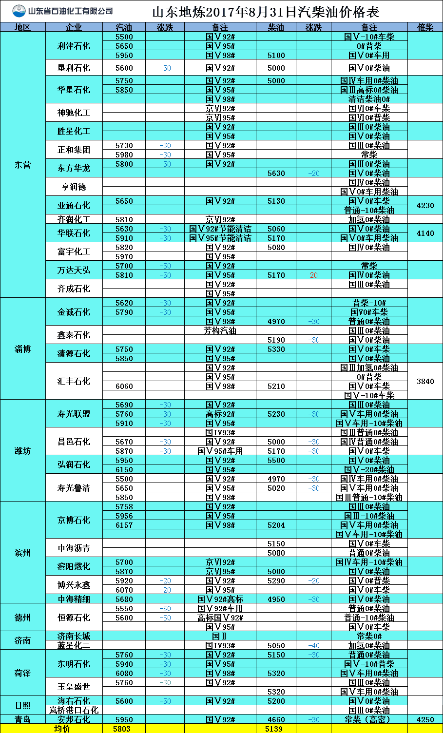 山東地?zé)?017年8月31日汽柴油價(jià)格表