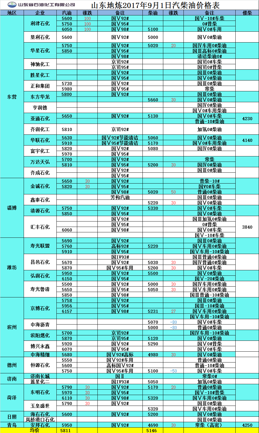 山東地?zé)?017年9月1日汽柴油價(jià)格表