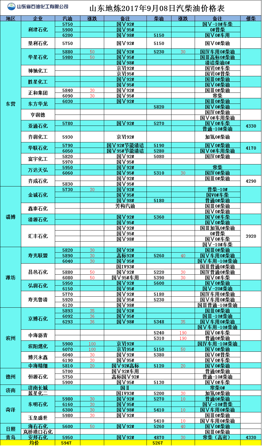 山東地?zé)?017年9月07日汽柴油價(jià)格表