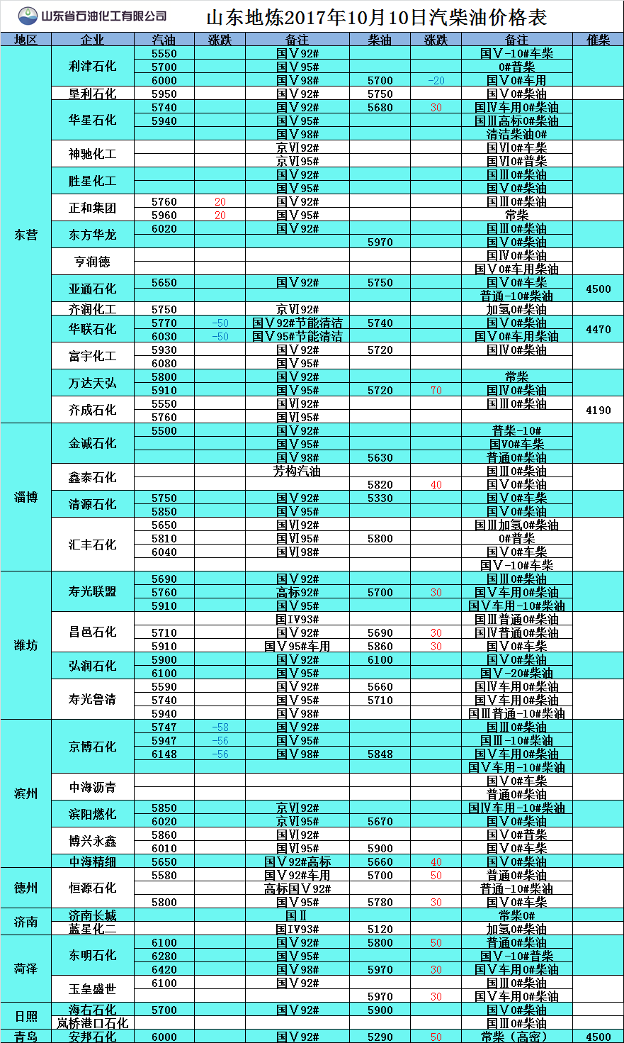 山東地?zé)?017年10月10日汽柴油價格表