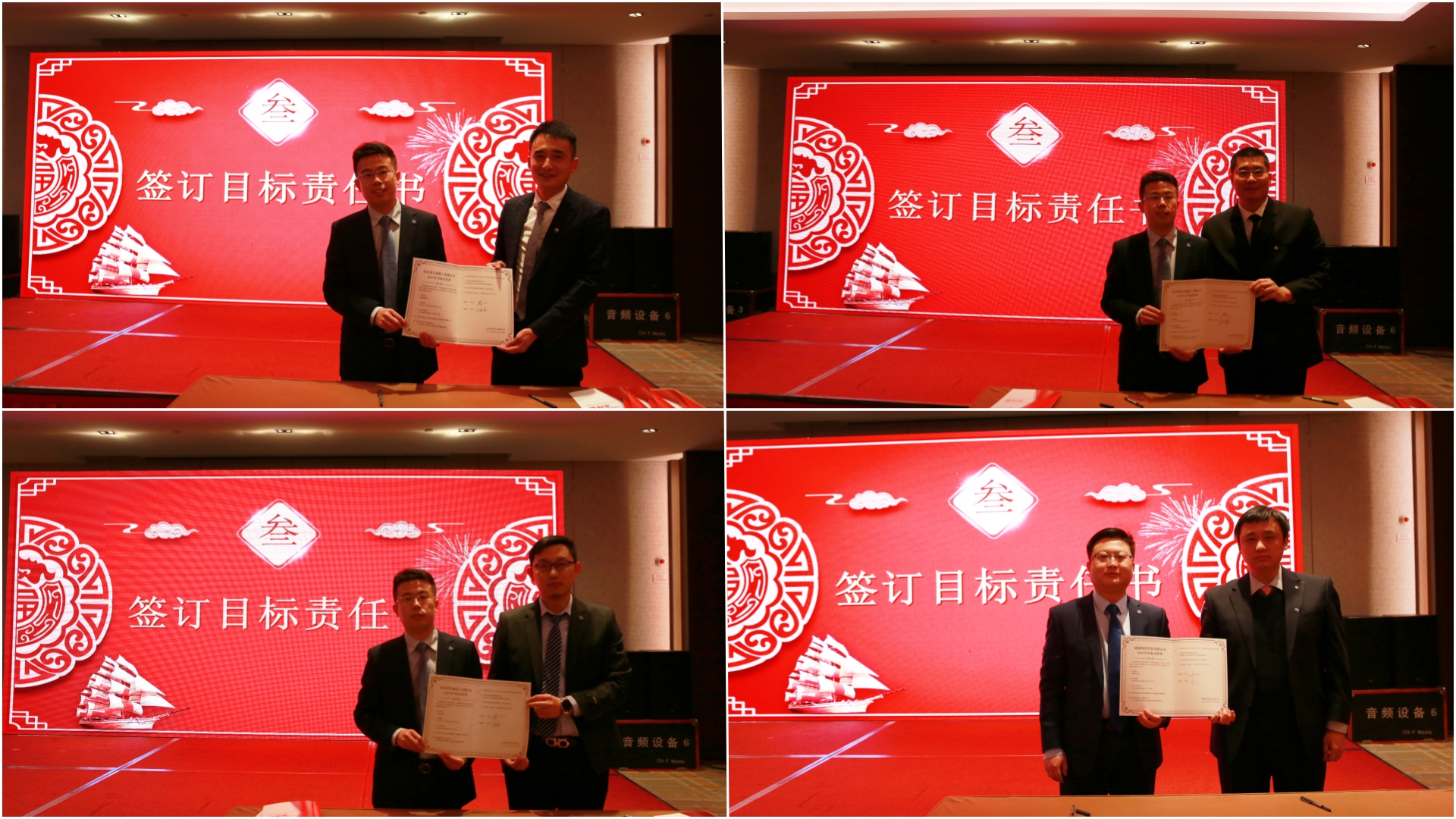 山東石化總經(jīng)理李作江、融泰保險(xiǎn)經(jīng)紀(jì)總經(jīng)理劉龍,分別上臺(tái)與各業(yè)務(wù)部門(mén)簽署2023年目標(biāo)責(zé)任書(shū)。