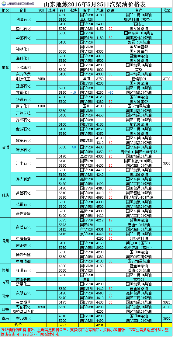2016年5月25日山東地煉汽柴油價格表