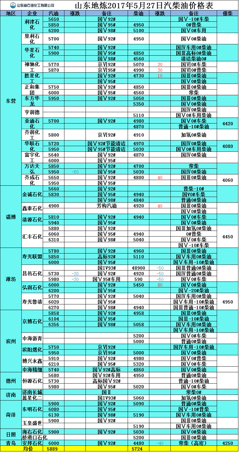 2017年5月27日山東地煉汽柴油價格