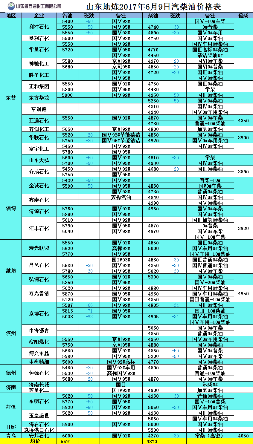 2017年6月9日山東地煉汽柴油價格