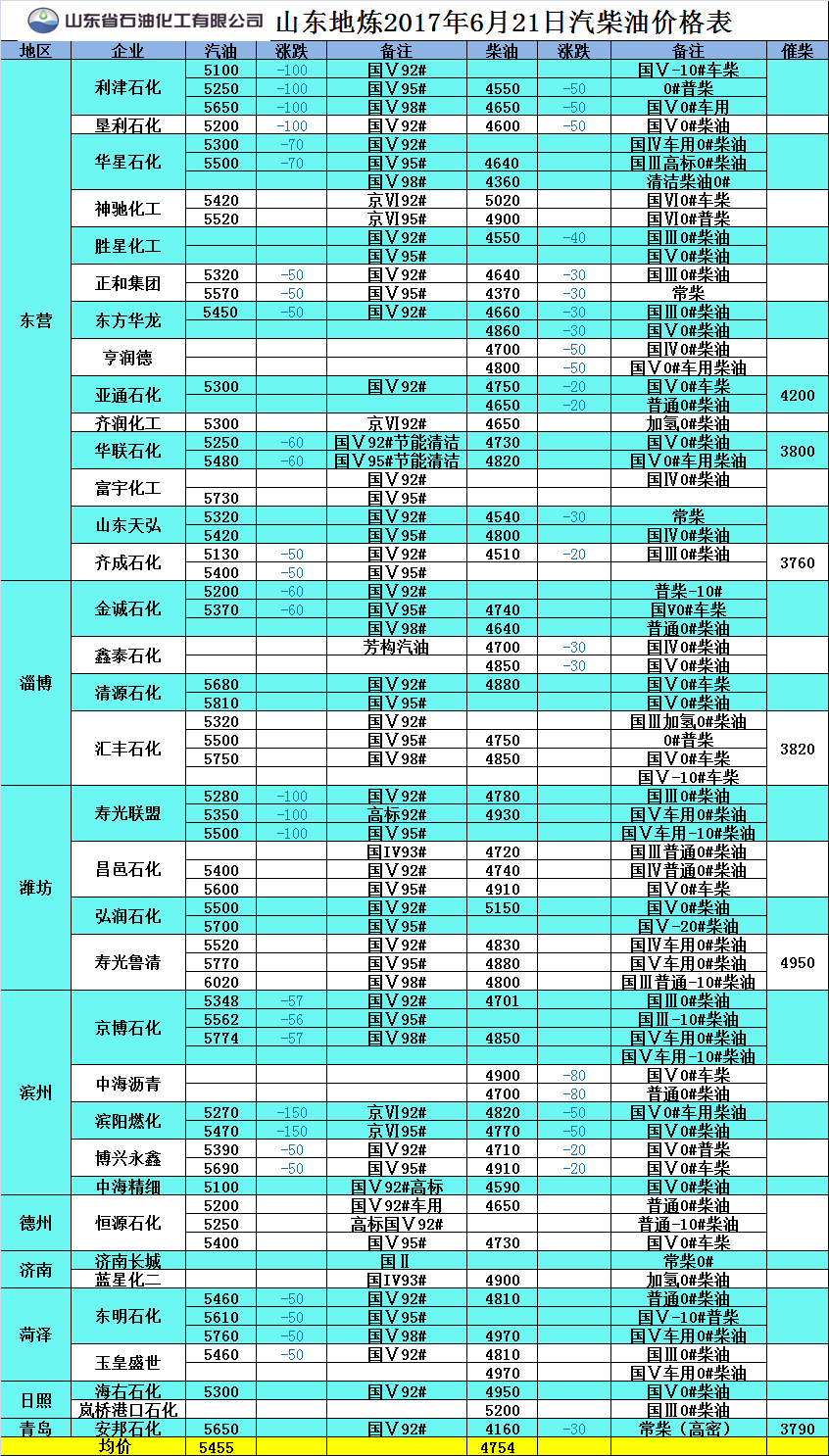 2017年6月20日山東地煉汽柴油價格
