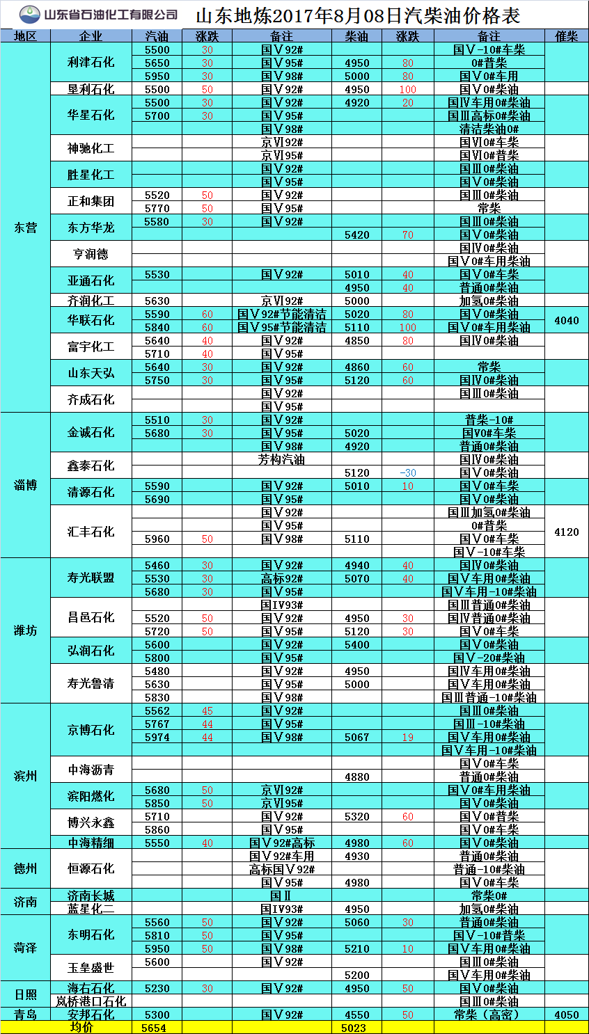 山東地?zé)?017年8月08日汽柴油價(jià)格表